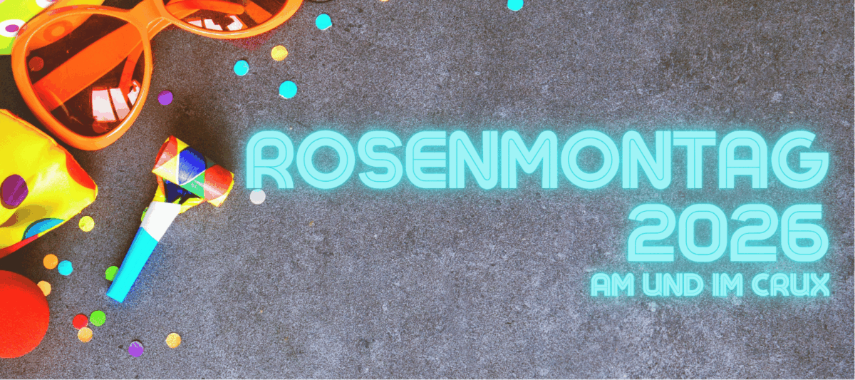 Das Crux und die katholische Jugendagentur laden euch herzlich ein den Großen Rosenmontagszug, am 16. Februar 2026 auf der Tribüne am Crux zu genießen mit anschließender Party im Crux.
