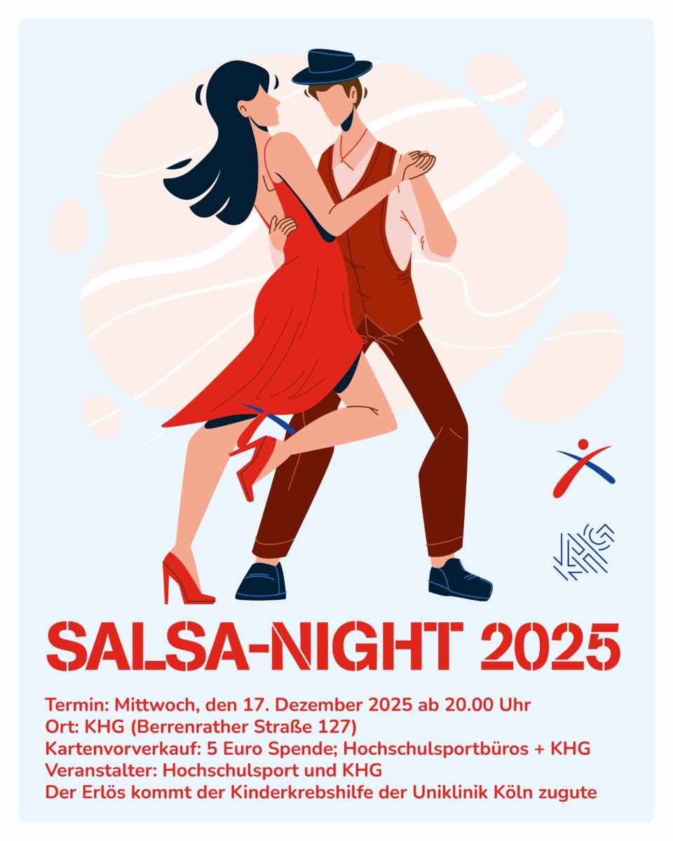 Am Mittwoch, den 17. Dezember 2025 findet zum vierten Mal unsere Große Salsa Night in der KHG Aula statt.